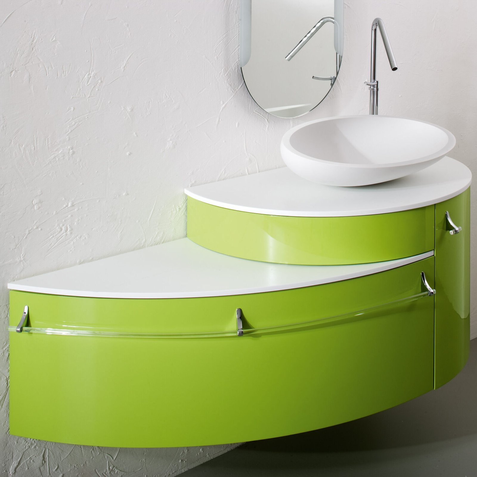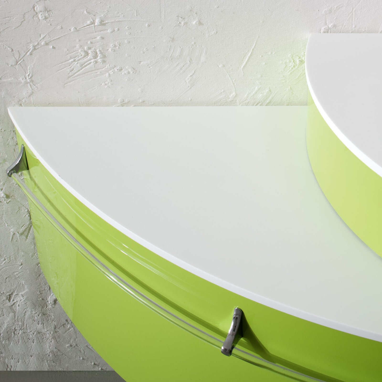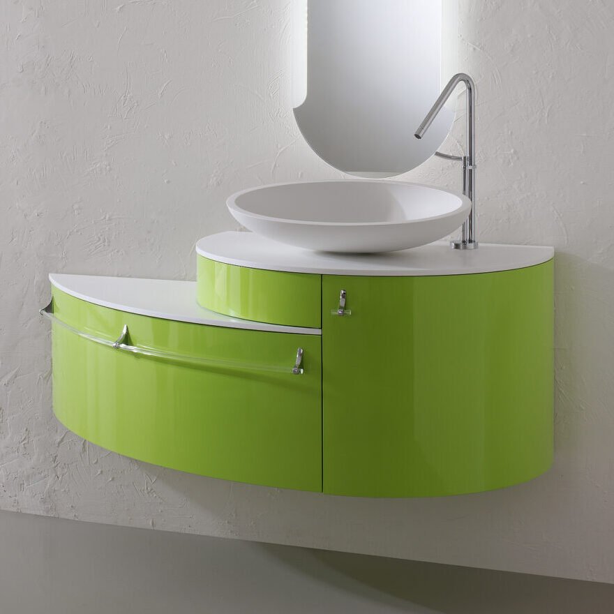 The vanity features a softly rounded front paired with a sleek countertop designed to support a vessel basin, complemented by an integrated side shelf that enhances both functionality and visual balance. The high-gloss lacquered finish accentuates the vanity’s fluid lines, delivering a luminous, modern aesthetic that elevates the entire space.