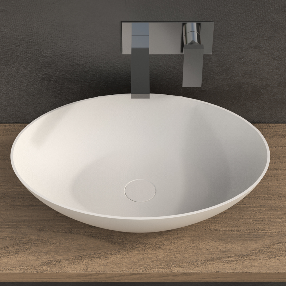 Freestanding washbasin. MOD. PS IDV 284773. Color: Matte white. Material: Solid surface. Dimensions: 24 x 16 x 6" - Weight: 17 Lbs. Grid drain not included. Top of drain matte white matching the vessel. ¼" edge. Available in 20" diameter: PS IDV 290248.